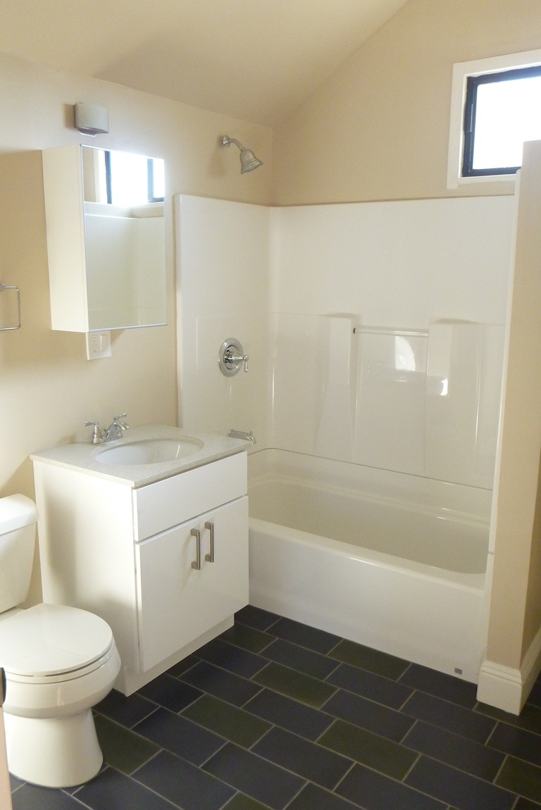 Upstairs you'll find a huge full bath complete with vanity sink with quartz top, a shower over tub, fan, overhead light and sconce, and a beautiful Heath tile custom floor. |