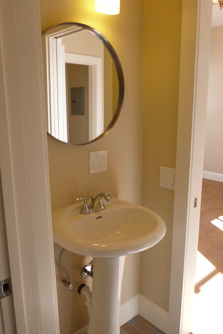 Back downstairs, this half bath is totally new. Stylish Heath tile on the floor, a beautiful pedestal sink, round mirror, fan, and overhead and sconce lighting. |