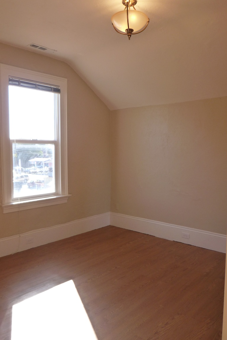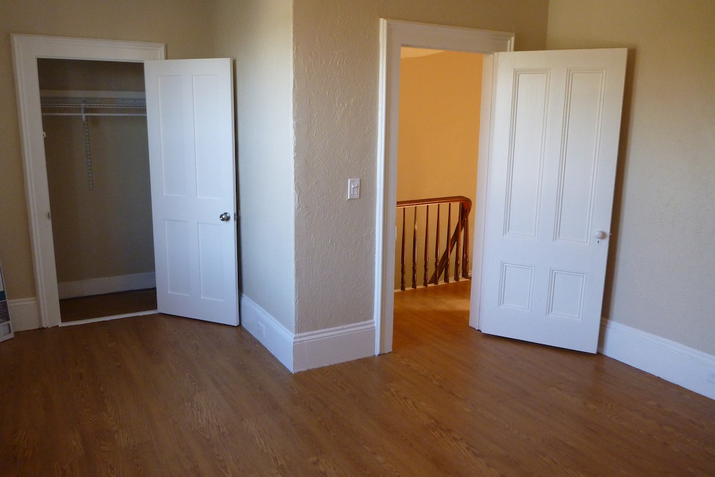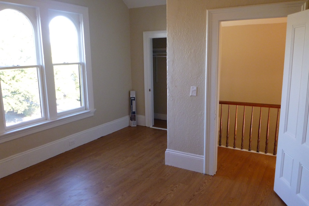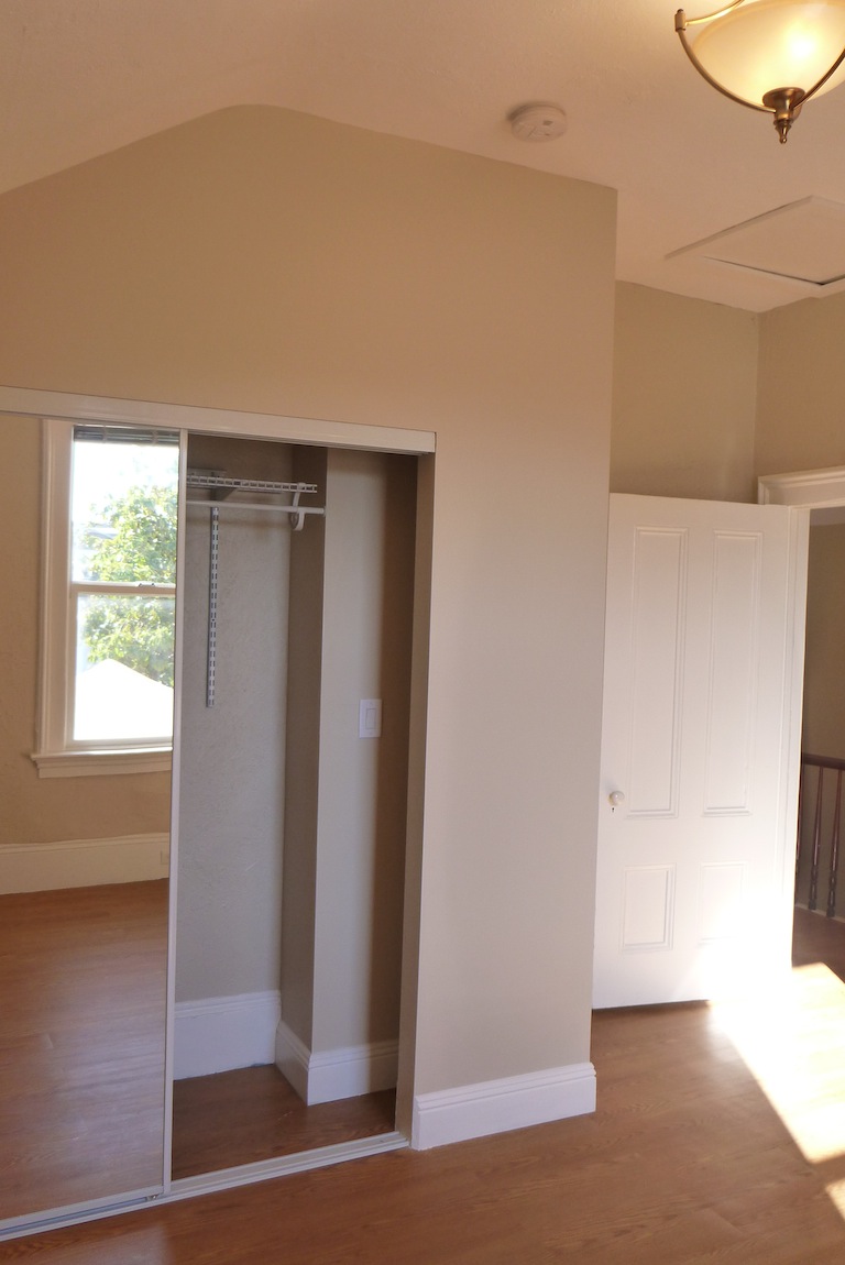 Now we've moved upstairs. The second bedroom is in the back of the house and so peaceful. It has a large closet, and a great view of Alameda's library, police station, city hall, and much more. |