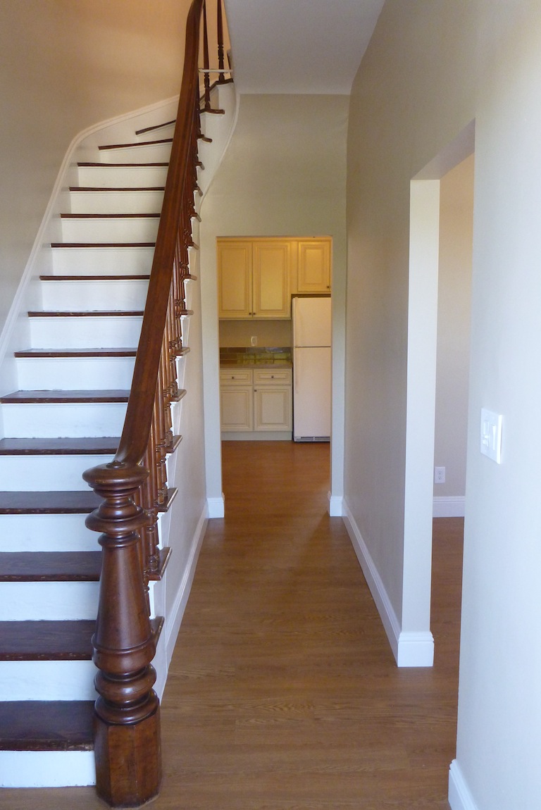 After climbing an exterior set of stairs, you enter through the grand front door with transom window and see the original curved staircase which has been lovingly refinished. |