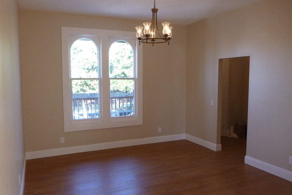 Looking back from the dining room into the living room. Notice the nod to the past with the graceful arched windows and the nod to the future where a thermostat controls central heating. |