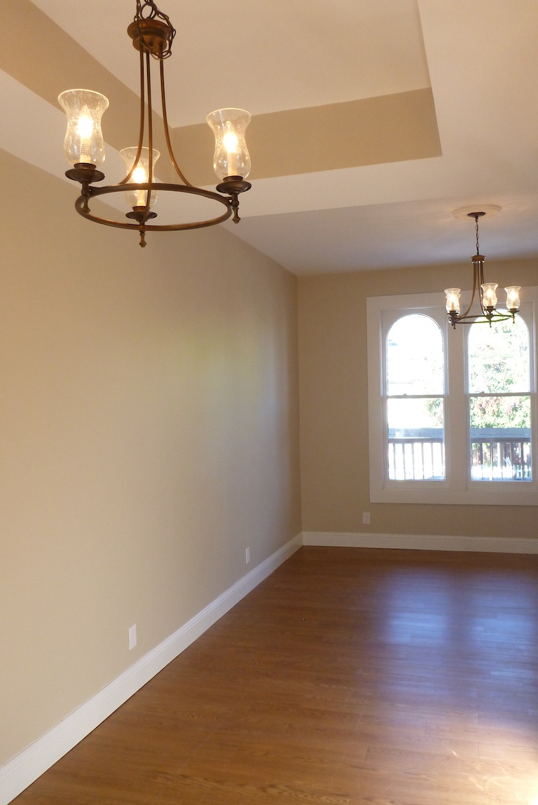 To your right you enter the living room and dining room. These two rooms have beautiful chandeliers, resilient solid surface flooring (throughout the house), designer paint, and get lots of natural light from several large windows. |