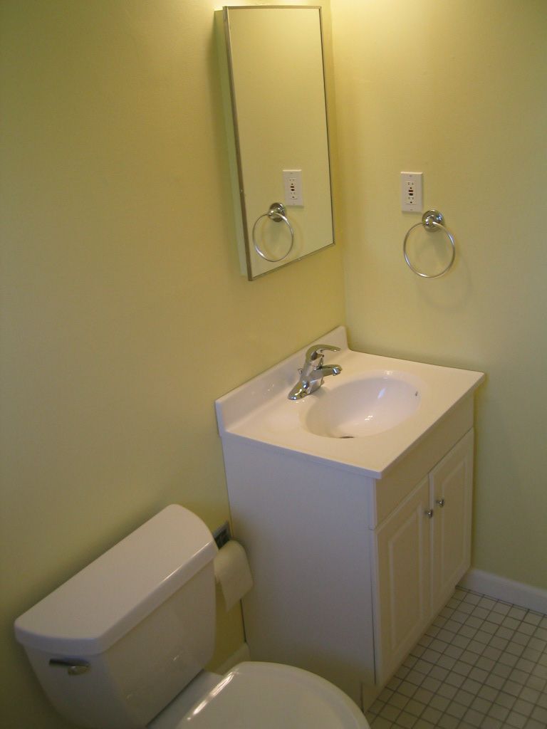 tile floor, a bath tub with classic grey tile surround, and vanity/sink and a medicine cabinet complete the package. |