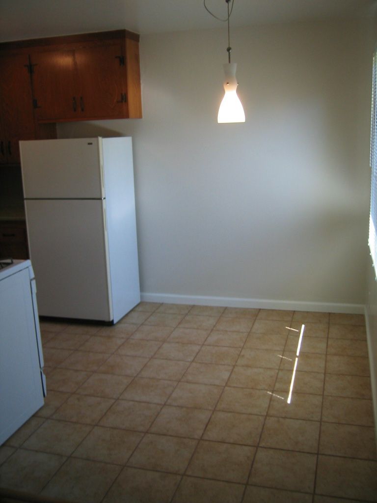 Now looking into the kitchen, you see the beautiful tile floor and that there is room for a table under the retro pendant lamp. |