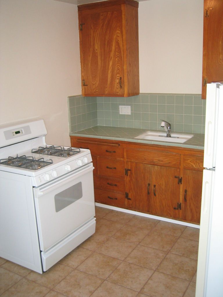 There are solid wood cabinets and drawers, a disposal, refrigerator, and an updated gas stove. An updated light fixture casts a warm glow on the original green-gray tile countertops. |