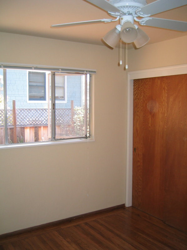 In the first bedroom, there is a large closet and window that looks directly out to the unit's own yard, complete with patio and redwood deck. |