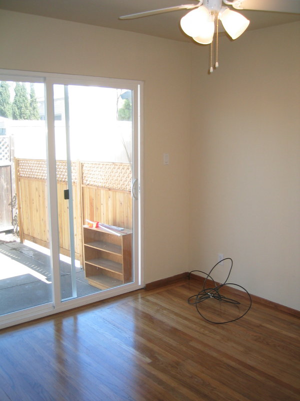 In the second bedroom, the large sliding glass door looks directly out to the unit's yard and deck. Sunlight streams in onto the hardwood floors. |